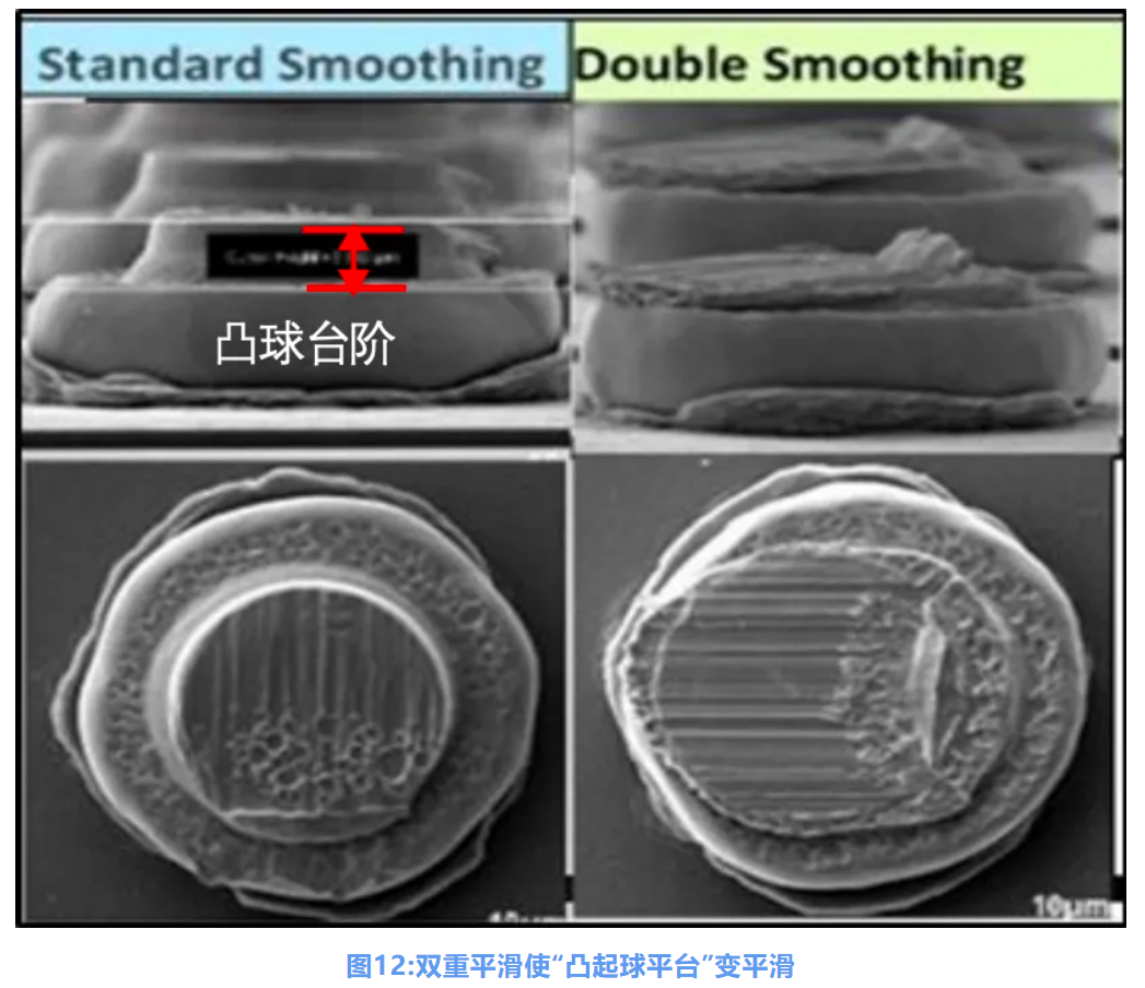 利用“双重平滑”的凸球平滑优化稍微改善了凸球上的最小拉力,因为该工艺完全平坦化了“凸球平台”,并且最小化了Stitch-Bond键合的“台阶”绝缘层接触表面(如图12所示)。然而,“双重平滑”工艺意味着在执行平滑运动时,劈刀尖端与绝缘层的接触更多,因此绝缘层在劈刀尖端堆积速度也会更快。