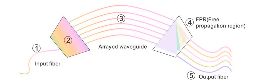 AWG基于光学波导,利用石英上的平面光波电路(PLC)制造阵列波导光栅。它在WDM系统中对多个波长进行多路复用传输,并在接收端解复用。