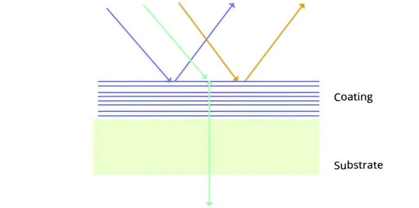 多层介质薄膜滤光片是一种具有多层高反射层的薄膜,层数从数十层到数百层不等。它们由两种具有不同折射率的介电材料组成,在层间交替分布。紧邻滤材基材和空气的层具有更高的折射率。